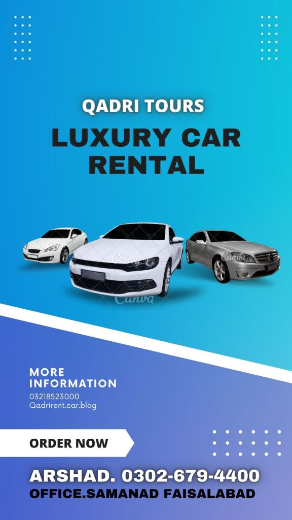 کامیابی کے20سال آپکے ساتھ بیس سال سے آپ کی خدمت میں پیش نیوماڈل ٹیوٹا کرولا ایکس ایل آئی جی ایل آئی ہونڈا سوک نیوماڈل سوزوکی ویگنار سوزوکی کلٹس سوزوکی آلٹو سوزوکی مہران ۔سوزوکی بولان سوزوکی ایوری سوزوکی اے پی وی ۔پینتھر ہائی روف گرینڈ کیبن بکس نیوماڈل لگژری کوسٹر ڈائیوو نشیں پارلر نیز تمام قسم کی گاڑیاں کرائے کے لئے دستیاب ہیں ۔آفس۔ قادری چوک سمن آباد فیصل آباد ۔ملک محمد ارشد قادری ۔گاہک ہمارے لئے باعث رحمت ہے ۔24گھنٹے سروسز ہر قسم کی ٹرانسپورٹ کرائے کے لئے حاضر ہے ۔